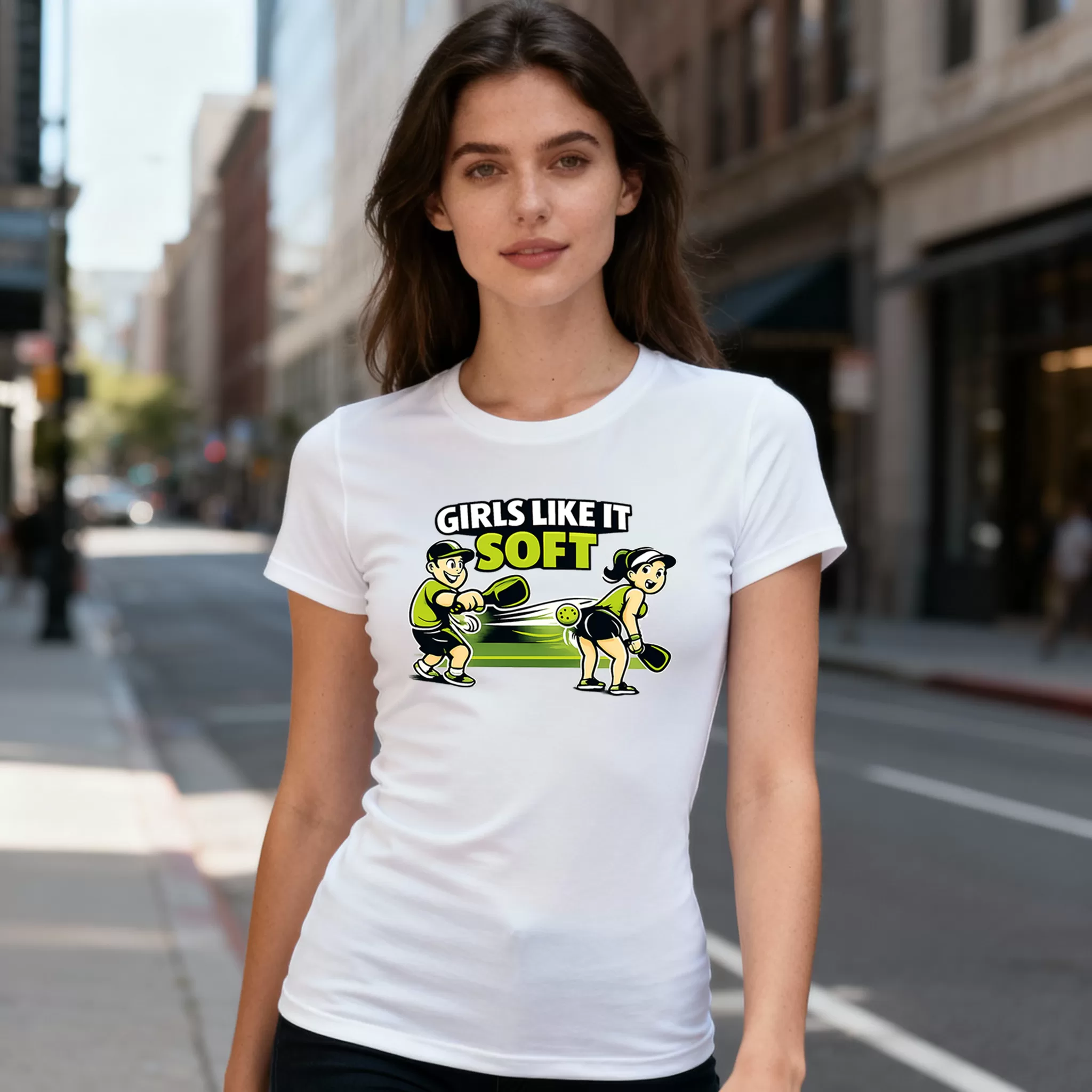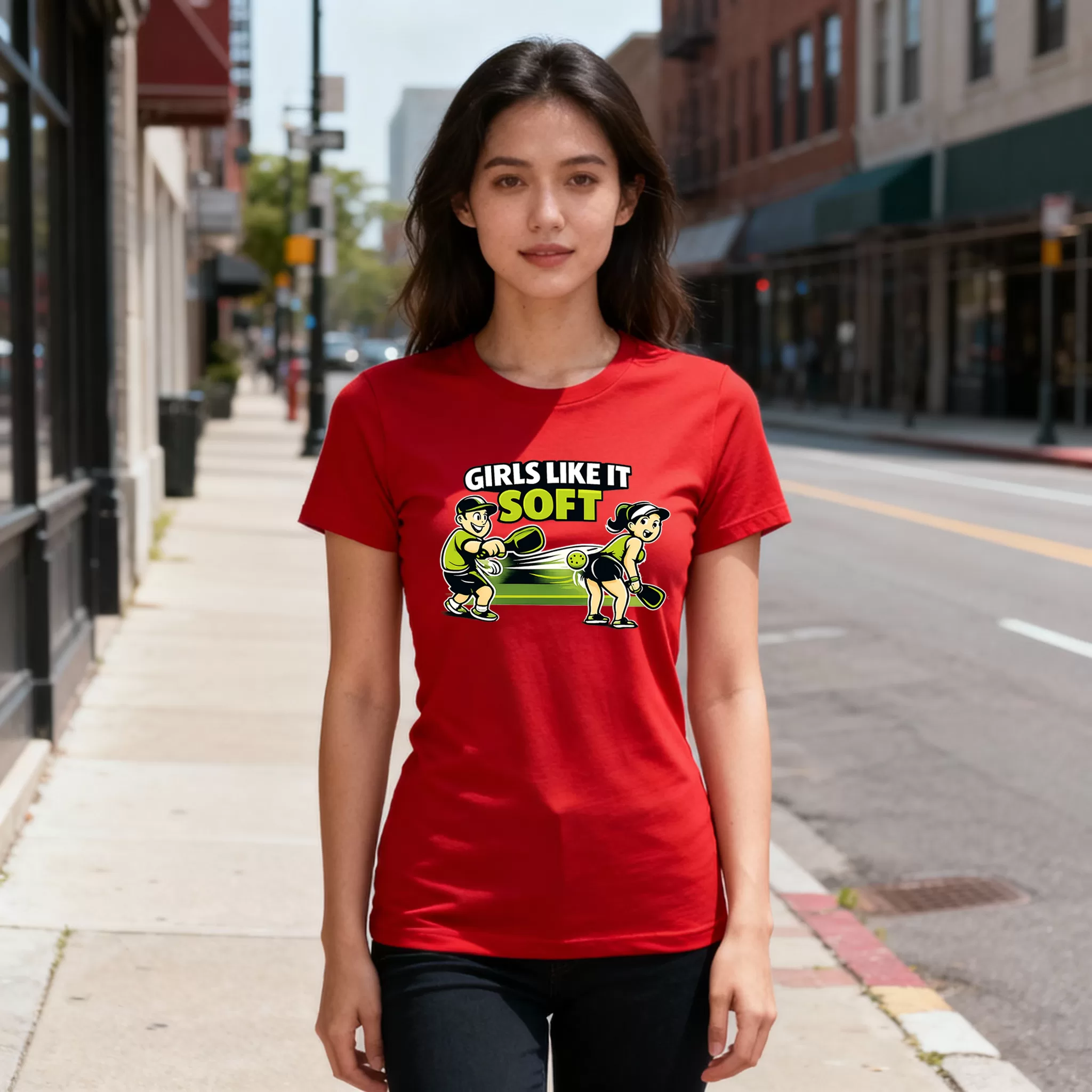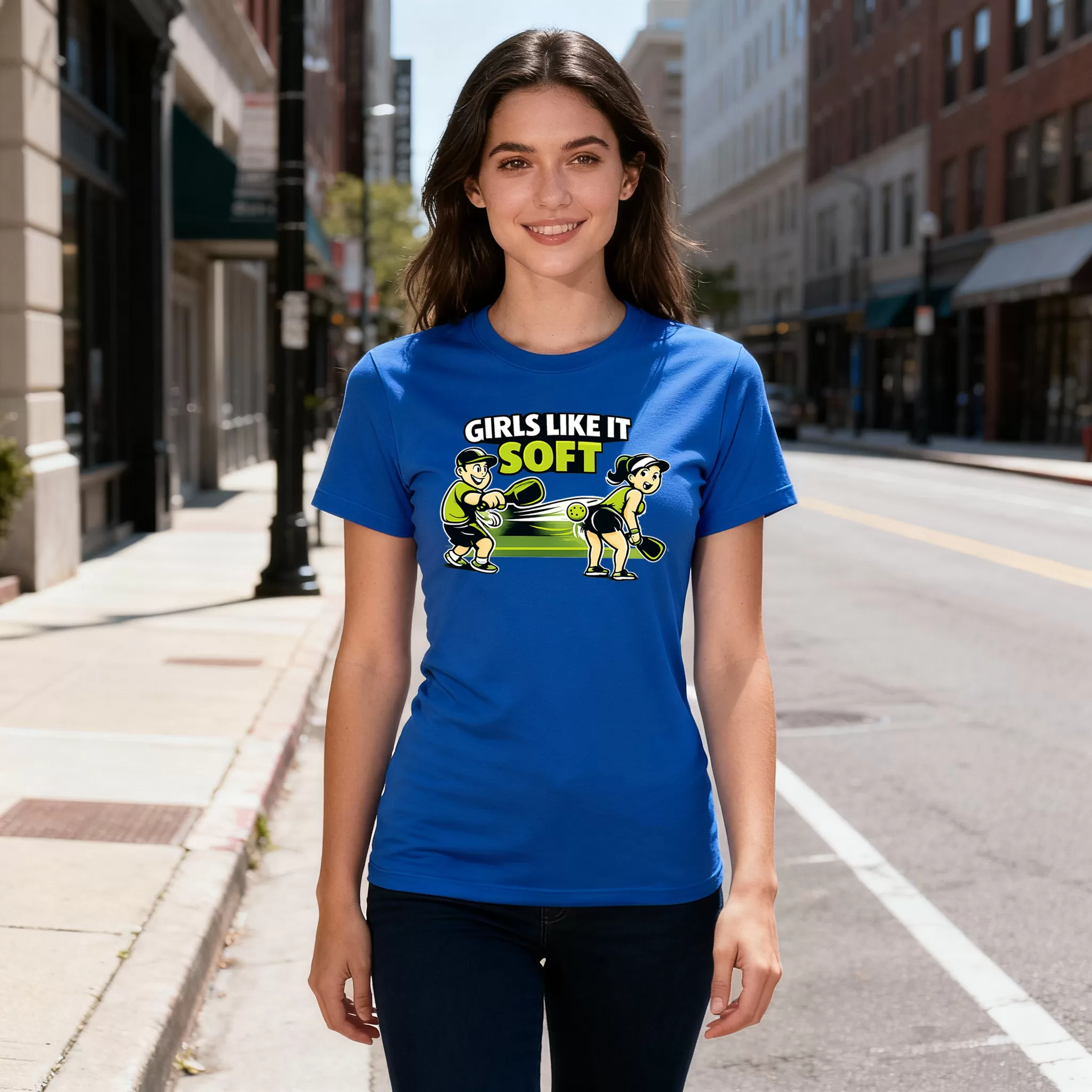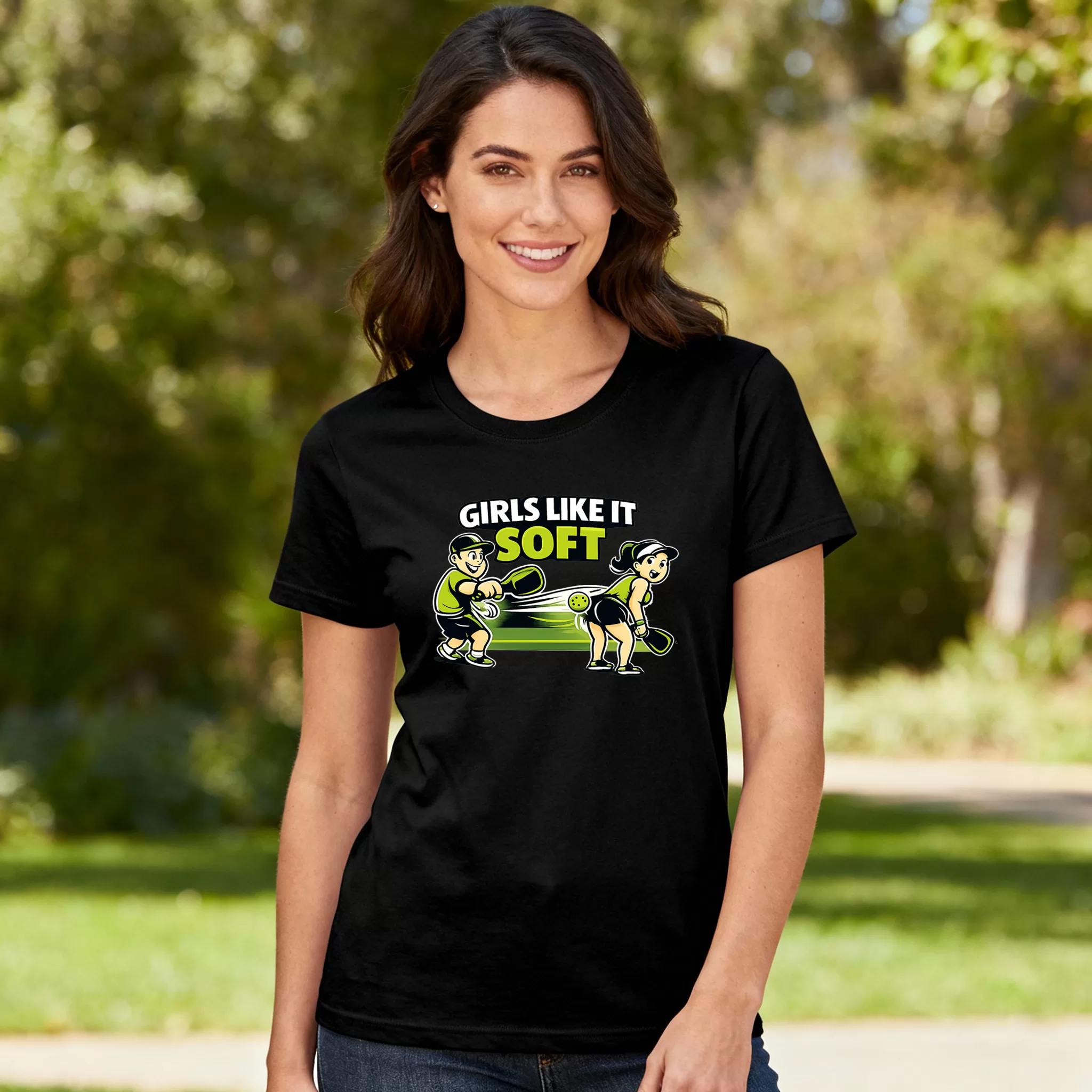 Woman T-shirt Colors: Sky Blue, Graphite Header, White, Royal Blue, Black and Red. Girls like it soft Woman’s pickleball theme t-shirt. 100% Ring Spun Cotton when in solid color and 65% Polyester / 35% Ring Spun Cotton when in a heather color.